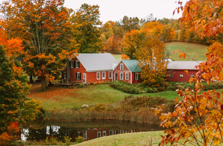 New England Autumn Jenne Farm House Red Barn Pond with Fall Foliage