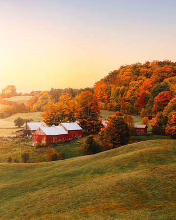 Beautiful Sunset Autumn Season Jenne Farm Vermont, USA. Warm Sun Glow Fall Foliage Colorful Trees, Rolling Hills Green Grass, Red Barn Rural America
