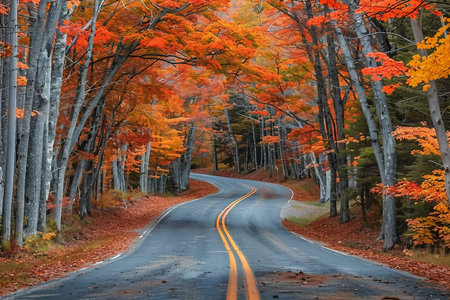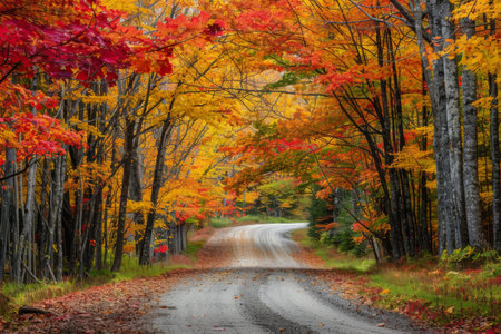A serene drive through a picturesque autumn landscape displaying vibrant colors of foliage. The winding road offers an inviting escape into nature's beauty.
