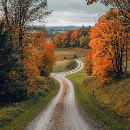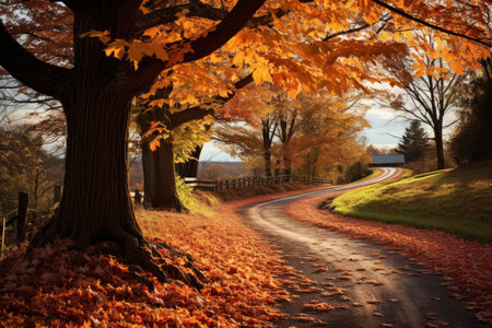 A charming countryside route surrounded by colorful trees and fields the perfect spot for a peaceful stroll. . AI generation