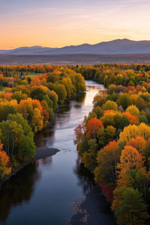 A breathtaking view of a river meandering through a vibrant autumn landscape, showcasing colorful foliage and a serene natural setting under a clear blue sky.