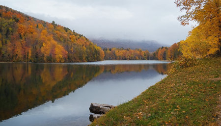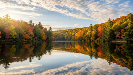 A stunning autumn scene showcasing vibrant trees and reflections on a calm lake. This serene landscape captures the essence of fall with colorful foliage.