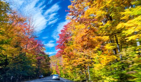 New England Road in Foliage Season, blurerd view. North East United States in October.