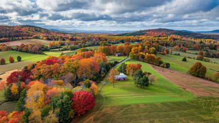 Panoramic view of a rural farm in autumn in Vermont.