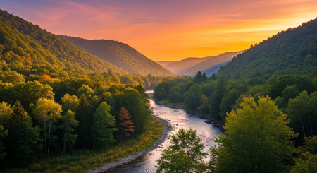 An aerial view a river winding through a dense forest ablaze with autumn colors. Golden sunlight bathes the trees and rolling hills in warm light.