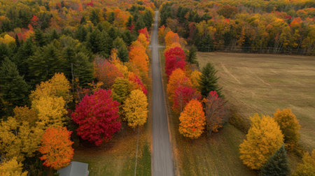 Experience the breathtaking beauty of autumn with this aerial view of a scenic country road surrounded by vibrant trees in a myriad of colors.