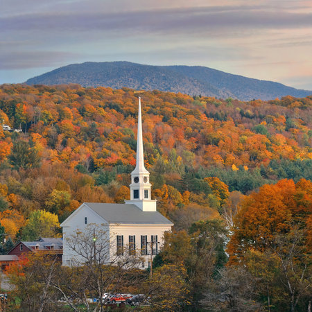 Stowe at sunset in Autumn with colorful foliage and community church in Vermont