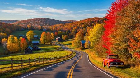 Autumn landscape with red car on the road in Vermont, USA
