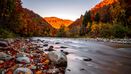 Vibrant landscape of a flowing river and sunlit hillside covered in red and gold fall foliage, long-exposure water