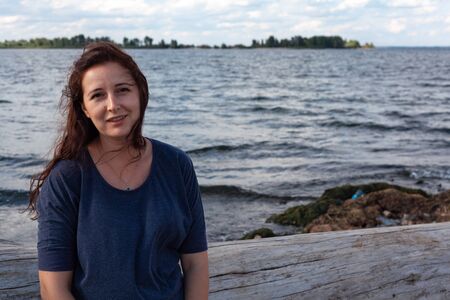 Plus size young woman smiling at the camera on the river bank on a summer day