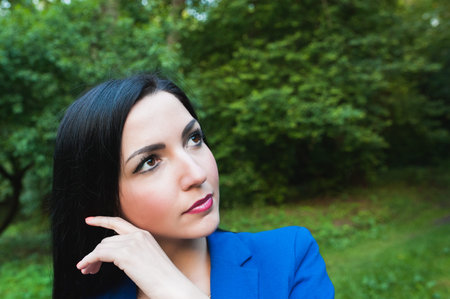 Beautiful brunette in a blue suit on the background of nature. Rest in the park after work. Violent brown eyes