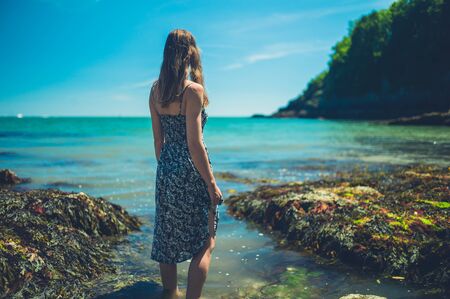 A young woman is paddling at the beach in summer