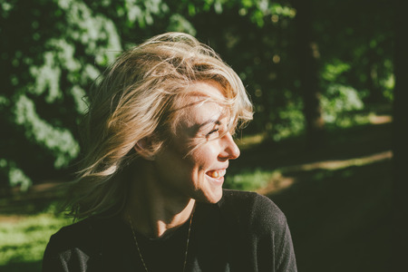 Portrait of a happy blonde woman, walking in park, smiling and looking to the side
