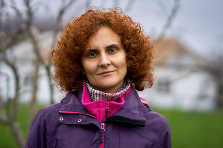 Curly redhead woman outdoor in the countryside, candid portrait