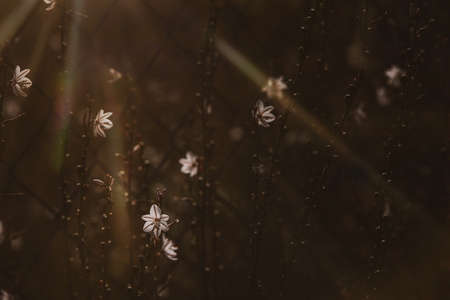 White meadow tiny flowers. Sunshine, wildflowers blurred background, bokeh, selective focus, warm sunlight