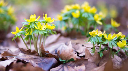 Yellow flowers of winter aconite (Eranthis hyemalis).