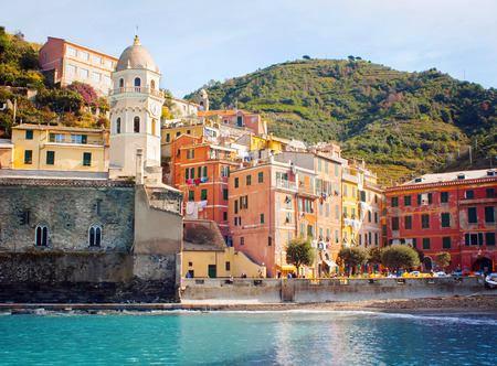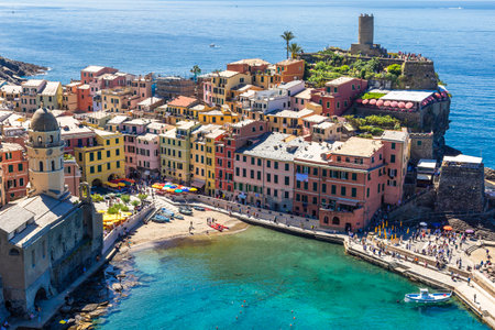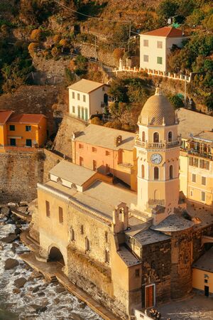 Landscape of Vernazza village with colorful old houses and church on the hill at sunny day. Famous village at Cinque Terre National Park at coastline in northwestern of Italy