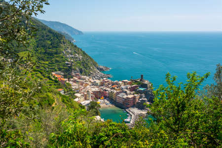 View from high hill of Vernazza houses and blue sea, Cinque Terre national park, Liguria, Italy