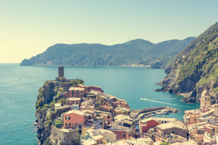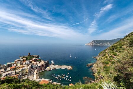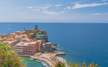 Landscape of coastline with Vernazza village in Italy on sunny day. Famous town in Cinque Terre region in northwestern Italy. Traveling italian landmarks concept