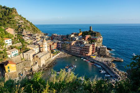 Vernazza - Village of Cinque Terre National Park at Coast of Italy. Beautiful colors at sunset. Province of La Spezia, Liguria, in the north of Italy - Travel destination and attraction in Europe.