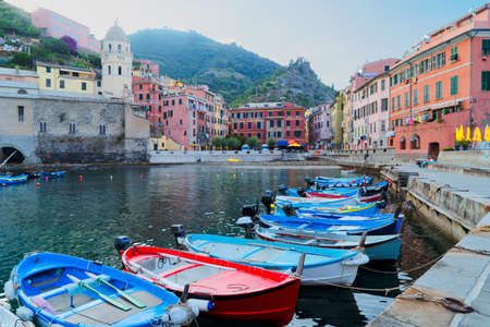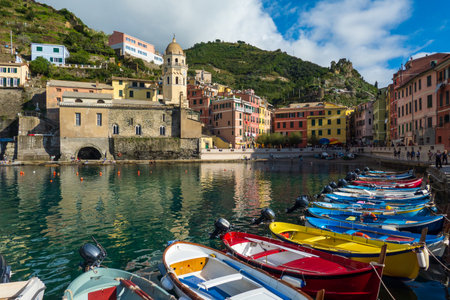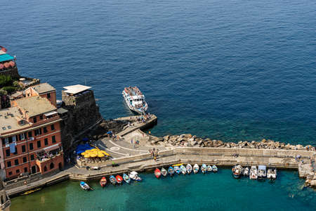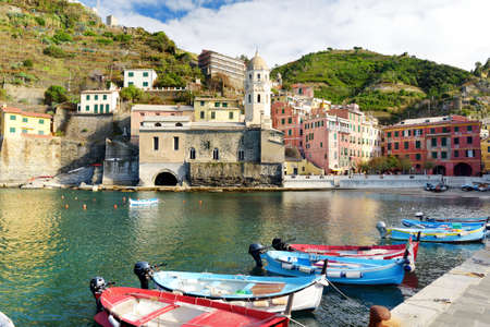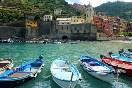 Colourful fishing boats in small marina of Vernazza, one of the five centuries-old villages of Cinque Terre, located on rugged northwest coast of Italian Riviera, Liguria, Italy.
