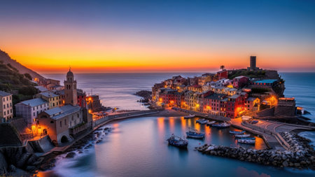 Beautiful evening view of the harbor of Vernazza, Cinque Terre, Italy at dusk