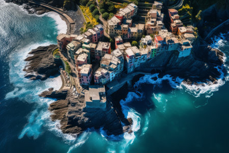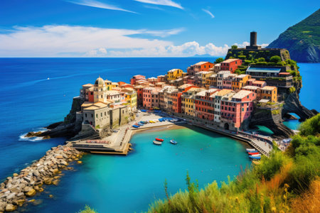 A Small Village on a Small Island in the Middle of the Ocean, View of the famous travel landmark destination Vernazza, a small Mediterranean old sea town with a harbor coast and castle, AI Generated