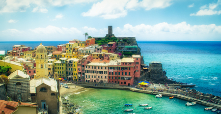 Beautiful landscape with colorful houses and boats on the cliffs in Vernazza, Cinque Terre, Italy, Europe