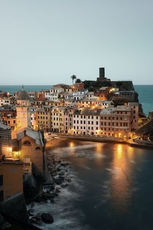 Vernazza, Italy / April 28, 2017 - The city is seen from the surrounding hills at sunset with the lights just coming on