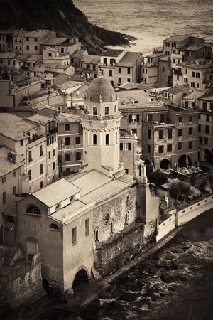 Vernazza with buildings on rocks over sea black and white in Cinque Terre, Italy.