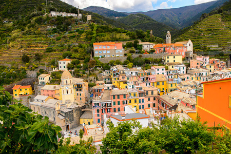 Vernazza, Colorful cityscape on the mountains over Mediterranean sea in Cinque Terre Italy Europe