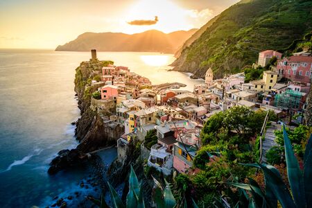 One of the most beautiful and visited mediterranean village with colorful houses on the cliffs at sunset, Vernazza, Cinque Terre, Liguria, Italy, Europe