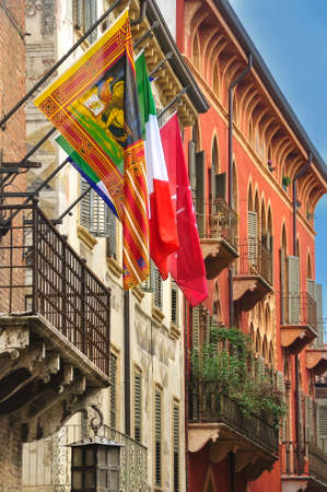 View of a traditional Italian old or retro residential building in a town square in Verona in Italy.