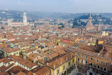 Top view of red brick city skyline from torre dei lamberti tower in Verona, Italy