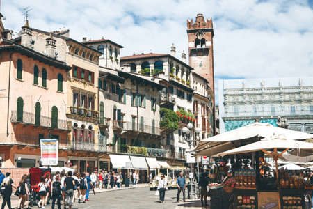 Verona, Italy - October 1, 2021: Piazza delle Erbe on a cloudy day.