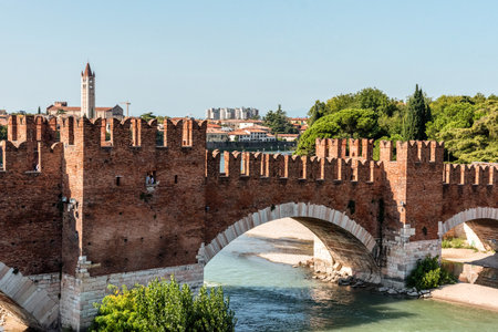Roman arch bridge over Adige River in Verona. Historical center of European city. Romantic sightseeng trip to Italy