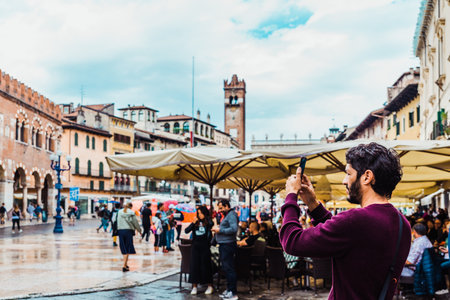 Verona, Italy - October 1, 2021: A novice tourist takes amazed pictures with his mobile to send to his family.