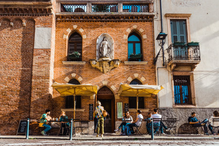 Verona, Italy - September 22, 2021: Tourists have a drink on the terrace of a traditional Italian bar