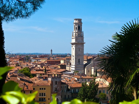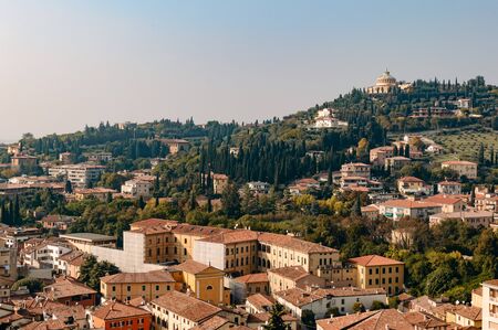 Verona cityscape seen from the hill at summer with the River Adige, Church of Santa Anastasia and the Lamberti Tower.