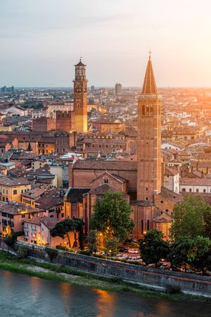 Beautiful sunset aerial view of traditional architecture in Verona in Italy.