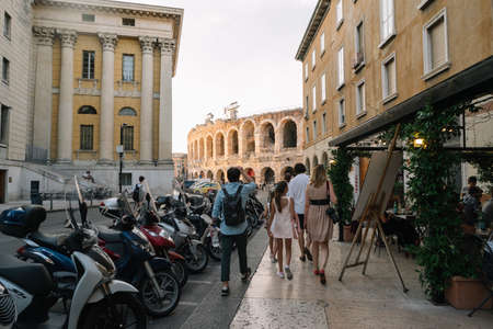 Verona, Italy - August 12, 2016: People are going to the Verona Arena. This is a Roman amphitheatre in Piazza Bra in Verona, Italy.