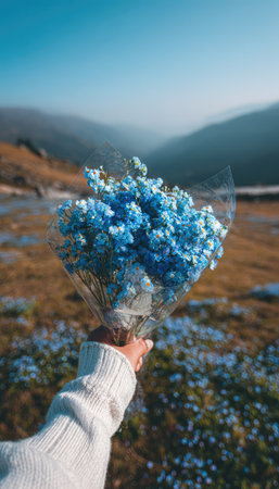 A person's hand holds a bouquet of bright blue flowers, set against a blurred landscape. The natural scene includes rolling hills and a clear, blue sky, suggesting an outdoor environment. The image uses soft focus, creating a visually appealing effect suitable for various commercial and editorial applications.