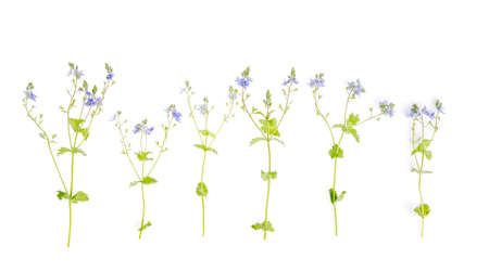 bouquet of delicate wildflowers in blue on a white background with single isolated flowers