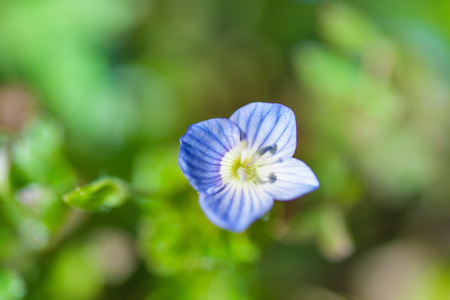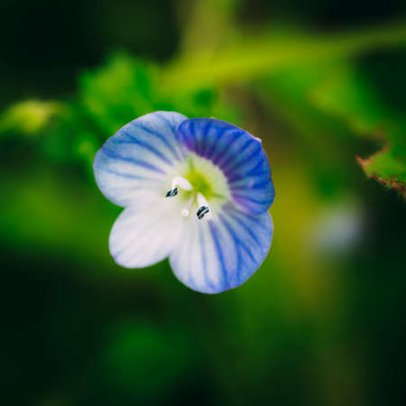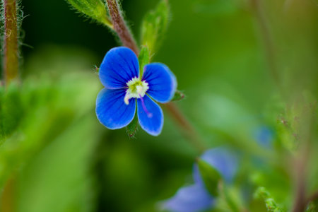 Blue flower Germander speedwell or Veronica chamaedrys on stem macro, selective focus, shallow DOF.