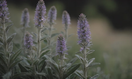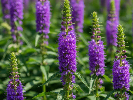 A close-up view of tall, slender purple wildflowers standing proudly in a lush green field. The flowers are densely packed with small, delicate blossoms, creating a striking contrast against the verdant foliage.