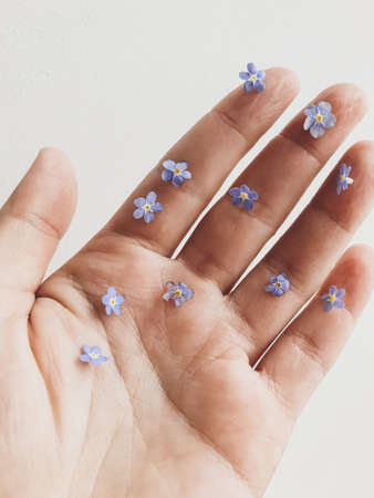 Beautiful blue spring flowers on female hand against wall. Forget me nots petals on palm hand. Skin care. Creative spring details. Vertical phone photo