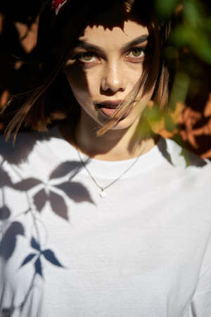 Fashion portrait of a sexy brunette woman with a make up wearing white clothes outside with tree shadows on a face