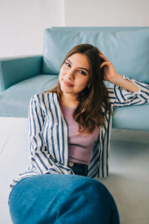 Young calm caucasian woman relaxing, sitting on the floor near sofa in modern living room, lazy happy woman resting at home.