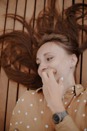 Young attractive caucasian woman relaxing on a bed in sunlight.