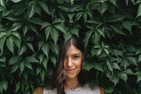 Stylish millennial girl standing in green leaves in city street. Sensual portrait of young brunette woman among greenery in park or garden. Calm moment